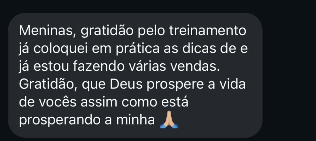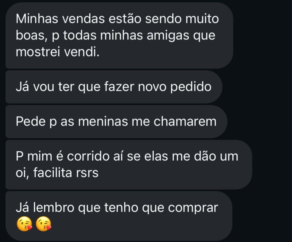 Você terá acesso a um grupo exclusivo no WhatsApp, materiais de divulgação profissionais, catálogos atualizados, treinamentos regulares e suporte direto comigo. Nunca estará sozinha nessa jornada!